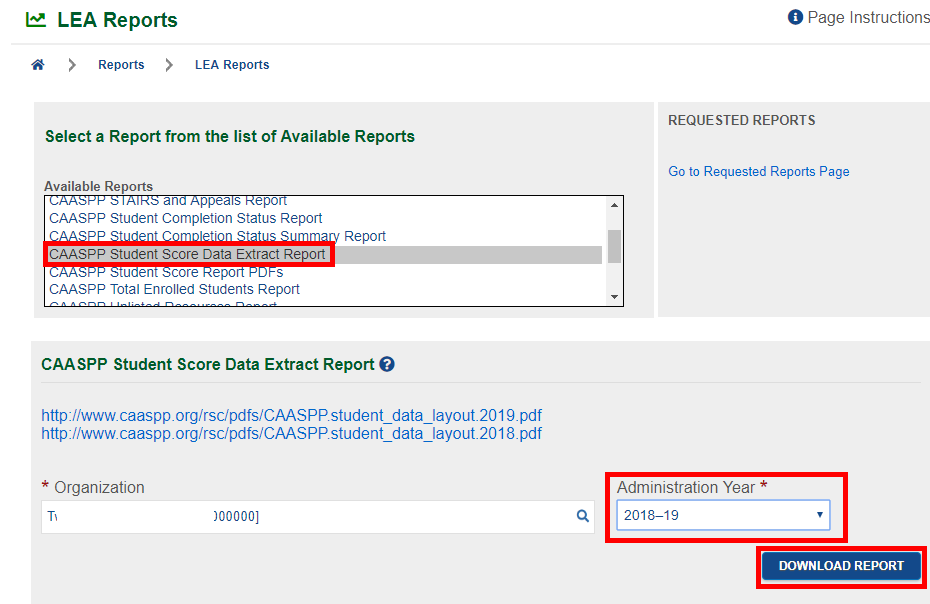 6. Choose the CAASPP Student Score Data Extract Report (Or ELPAC scores) choose the year and click DOWNLOAD. Remember to save the file somewhere that you won't forget. If your browser window is still open you can press Ctrl +J to see your recent downloads.