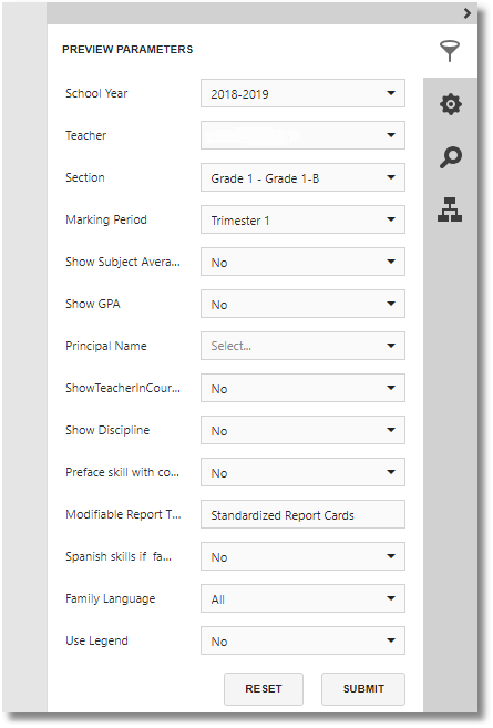 Parameters (AKA Filters) allow you to access data based on your choices. Work your way from the top down since many sub filters are based on the previous choice. For example depending on the school year choice only that year’s teachers’ classes are available for viewing.