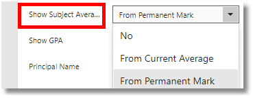For the subject average you can choose from current gradebook average or the permanent mark. The current average is constantly being calculated in the gradebook. The permanent mark is what is copied to the report card mark at the end of the term. It can be changed by a teacher in a situation where the calculated average is B+ but the teacher wants to give the student and A-. Most often they are the same.