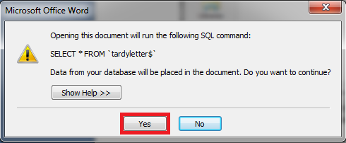Microsoft Word will launch and you'll be prompted to allow for the connection of the data with the letter. Choose 'Yes'. |