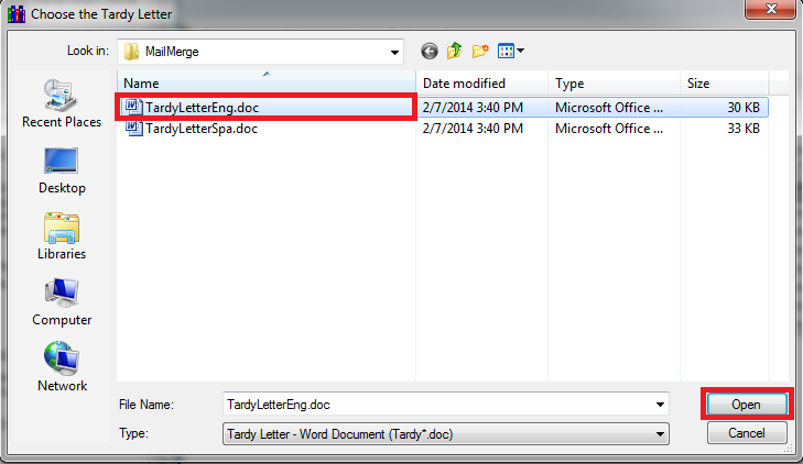 Every time you run a mail merge report, a window will pop up asking for the location of the letter. Go to that folder and select the letter and click 'Open'.