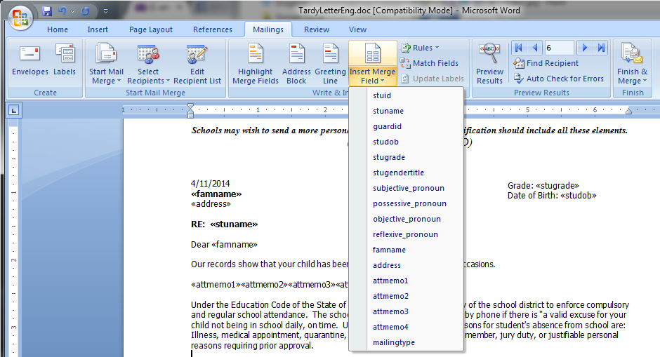 Whenever you need to print a new letter with updated information (ie. different date range, different amount of tardies/absences etc.), run the report from SchoolWise. This will update the data that is 'merged' into the letter. Be sure to close any open letter before running the report.