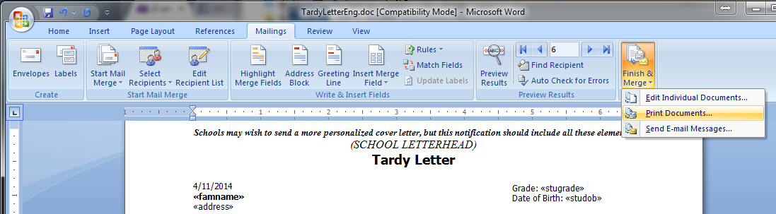 When you are ready to print the letters, select 'Finish & Merge' and then 'Print Documents'.